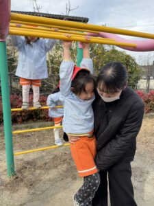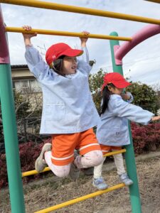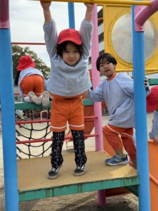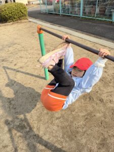 鉄棒やうんていでは、先生もびっくりするくらい上手にぶら下がったり、足を高く掛けてかっこいいポーズを見せてくれるお友達も!「先生、手伝って~」と甘える姿もあれば、「一人でできるよ!」と手足をしっかり使ってロープのジャングルジムに果敢に挑戦する姿もあり、その成長ぶりに驚かされます。