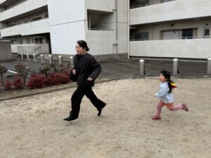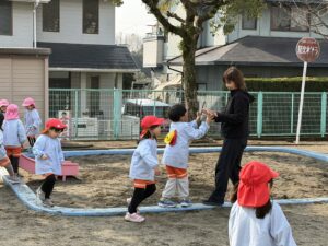お友達同士で長縄跳びに挑戦して元気いっぱいにジャンプしたり、先生と全力で追いかけっこをして走り回ったりと、公園中から楽しそうな笑い声が響いていました。