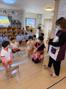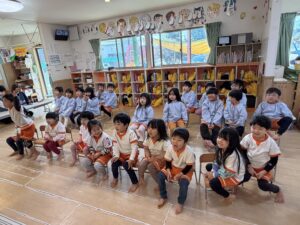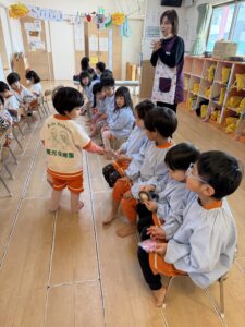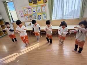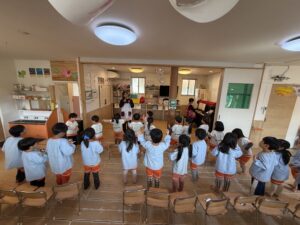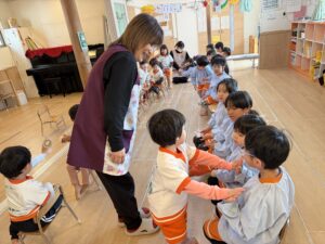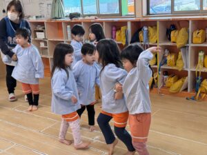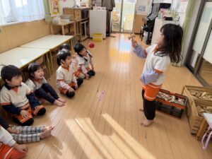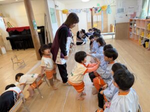 先生の明るい声や音楽に合わせて、みんなでお行儀よく輪になって座ったり、立って元気いっぱいに踊ったりして楽しみました。