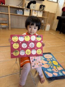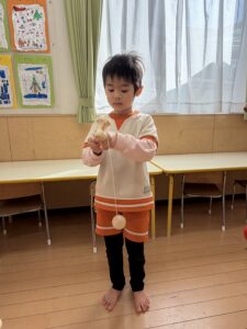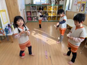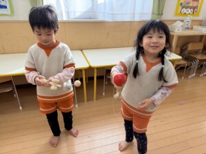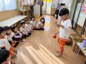 剣玉コーナーでは、真剣な表情で何度も挑戦する姿が!お皿に見事乗せることができると「できたー!」と大喜び。さらには、上手にできたお友達の周りにみんなが自然と集まり、お行儀よく座って「すごいね!」と見学する可愛らしい”剣玉ショータイム”も始まっていましたよ✨