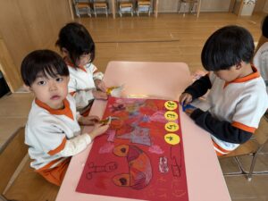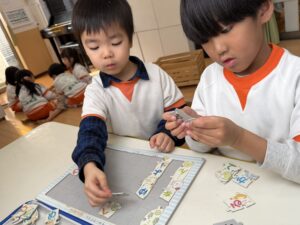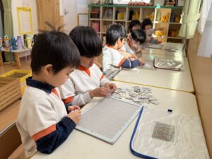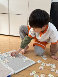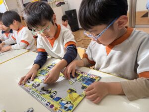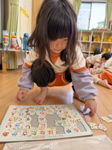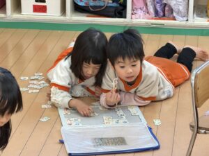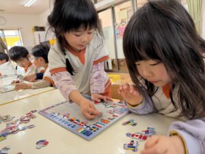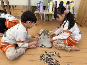 パズルコーナーでは、少し難しい世界地図の国旗パズルや、ひらがなのパズルに挑戦!一人で黙々と取り組むだけでなく、床に寝そべりながら「この国旗はここじゃない?」「『せ』はどこかな?」とお友達同士で教え合い、協力してピースをはめていく姿に大きな成長を感じました。