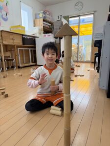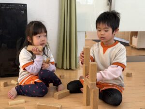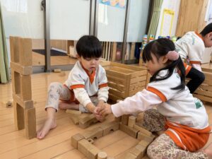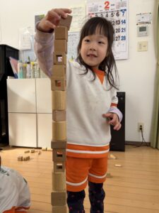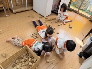 積み木コーナーでは、「ここはお城にしよう!」「もっと高く積めるかな?」と、いろんな形の積み木を組み合わせて大作を作っていました。円柱の積み木を倒れないようにそーっと慎重に高く積み上げる、集中力ばっちりのお友達もいました!