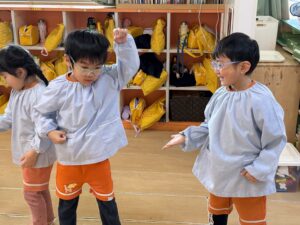 体全体をたくさん動かしながら、お友達と一緒に違う国の言葉やリズムに自然と親しんでいるきりん組さんです♪