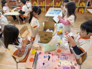 • 🍰ケーキ屋さん:空き箱を白い紙で丁寧に包んで、可愛く飾り付け。美味しそうなケーキが完成間近です!