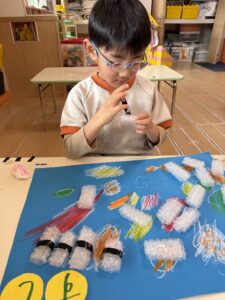 • 🍣お寿司屋さん:なんと「プチプチ(緩衝材)」をシャリに見立て、黒いテープを海苔にして本格的なお寿司を握っています!とっても美味しそうです。