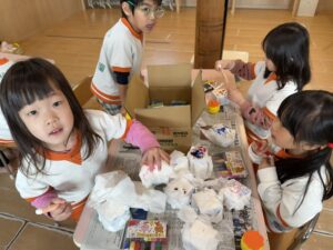 みんなで「いらっしゃいませ~って言うんだよ!」「これ、美味しそうでしょ?」と、お客さんが来てくれるのを楽しみにしながら、アイディアを出し合ってワイワイ楽しく製作を進めています。本番でお店がオープンするのが待ち遠しいですね!