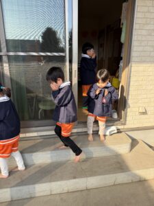 「煙を吸わないようにね」というお約束をしっかり守り、自分たちでお口とお鼻を両手でしっかり覆いながら避難!お部屋のテラスから園庭へ出る際も、段差で慌てて押し合うようなことは一切なく、落ち着いて安全に避難することができました。