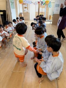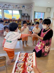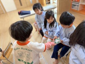 転園するお友達からも、「遊んでくれてありがとう!」と、かっこいい折り紙の「手裏剣」を一人ひとりに手渡しでプレゼントしてくれました!思いがけないプレゼントに、みんな大喜びです。