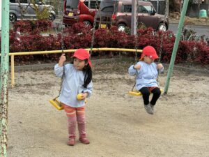はなまる公園では大きな滑り台をシューっと滑ったり、団地の公園でもカラフルな遊具に大喜びで、ニコニコ笑顔が弾けていました。順番を守って仲良くブランコを漕ぐ姿も立派です。