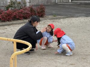 体を動かすだけでなく、地面に木の枝でお絵かきを楽しんだり、砂場のふちを平均台のように歩いて先生と笑顔でハイタッチをしたりと、それぞれが好きな遊びを見つけて大満喫!