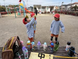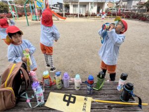 色とりどりの水筒を並べて「ぷはーっ!おいしい!」と、しっかり水分補給もばっちりできました。