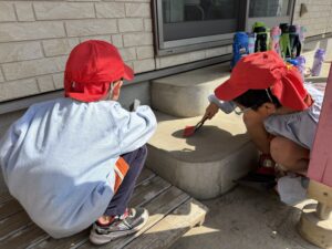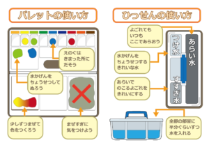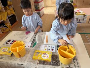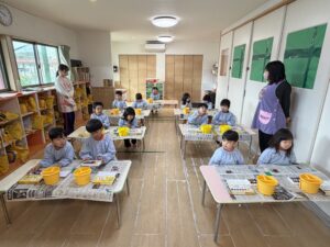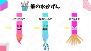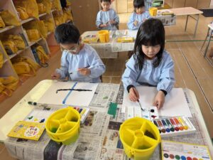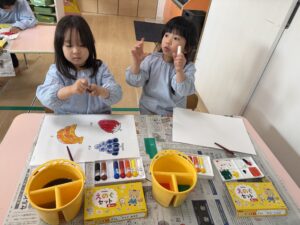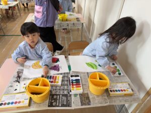 今回は本格的に、パレットや筆洗(お水のバケツ)の使い方、筆の正しい持ち方(えんぴつ持ち)をお勉強しました。筆の水分量のお話では、「ニコニコ筆(ちょうどいい)」「泣き虫筆(お水がポタポタ)」「おこり筆(バサバサ)」という言葉でわかりやすく確認。「今はニコニコ筆かな?」と、自分でお水の量を上手にお部屋で調節する姿に感心しました。