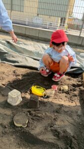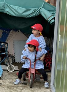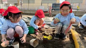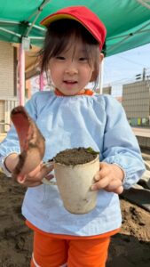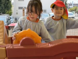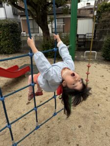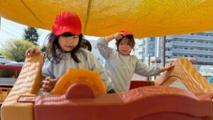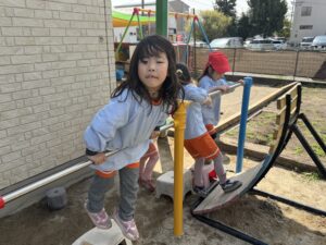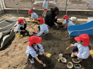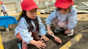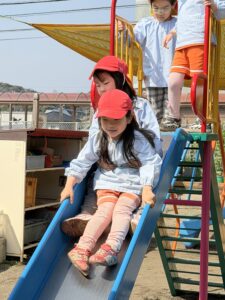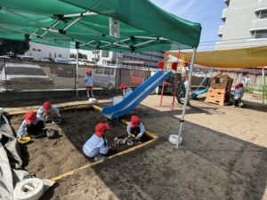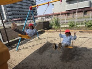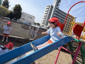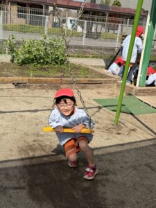 園庭遊びでも、きりん組さんのパワーは全開です!砂場で大きなお山を作ったり、ブランコやすべり台などの遊具をお友達と順番を守って楽しんだりと、お友達同士の関わり合いもぐっと深まったように感じます。