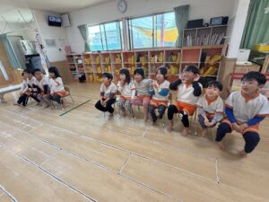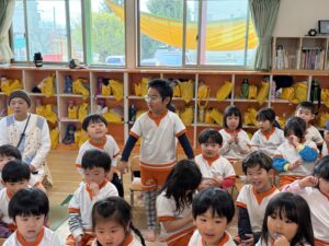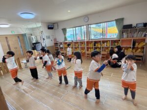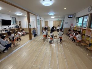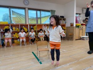 「椅子取りゲーム」では、音楽に合わせてワクワクした表情で椅子の周りを歩き、見事椅子に座れるとピョンピョン飛び跳ねて全身で大喜び!惜しくも座れなかったお友達も、周りの椅子に座って手拍子をしながら元気に応援してくれました。