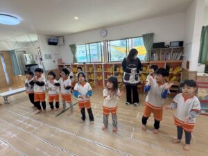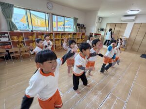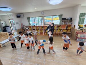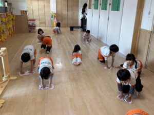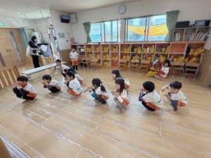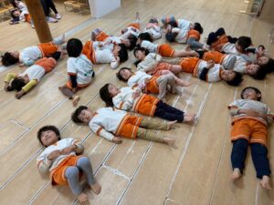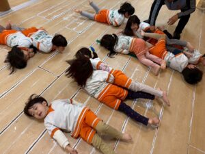 「雷ゲーム」では、先生の合図で床にゴロン!と仰向けに一斉に寝転がったり、お友達同士でくっついて大笑いしたりと大盛り上がり!