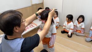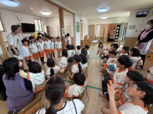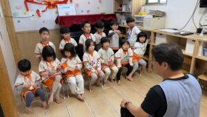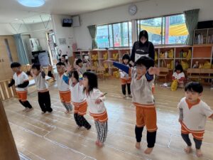 お部屋での「韓国語遊び」では、まずはみんなで椅子に並んで座って元気にご挨拶。その後は立ち上がって、思い切り体を動かしました!
