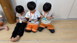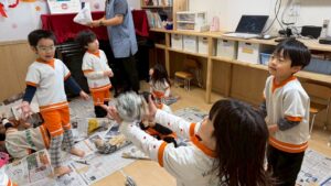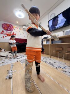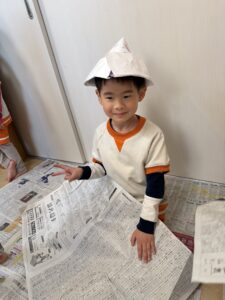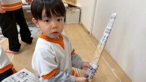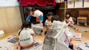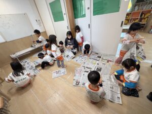 細長くちぎってビリビリという感触を楽しんだり、丸めてボールにして投げ合ったりと、普段お家ではなかなかできない遊び方に大興奮でした。身近な素材から自分たちで遊びをどんどん展開していく姿に、この1年での確かな成長を感じました。
