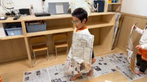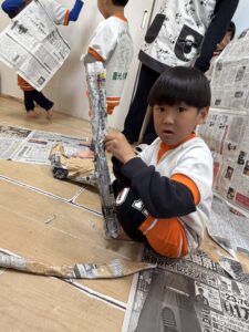新聞紙のお布団に入って「おやすみなさーい」と気持ちよさそうに寝転がったり、先生に兜を折ってもらってかっこよく被ったり。また、新聞紙をクルクルと丸めて強い剣を作ってポーズを決めたり、足や体にテープで巻き付けてロボットに変身したりと、子どもたちの想像力は大爆発!