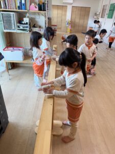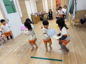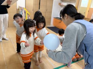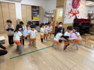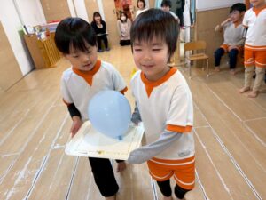 続いては、画板を使った「風船運び」です。今回はなんと、きりん組さんとうさぎ組さんのクラス対抗の競争!お友達とペアになって画板を持ち、ふわふわの風船を落とさないように息を合わせて急いで運びます。「がんばれー!」「早く早く!」と応援にも熱が入り、お兄さん・お姉さんとして絶対に負けられないきりん組さんの真剣な表情がとてもかっこよかったですよ!