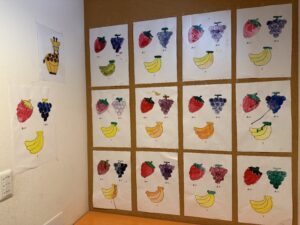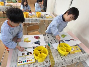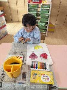 使い方がわかった後は、いちご、ぶどう、バナナのイラストに色塗りです。「あか・あお・きいろ」の絵の具を使って、線からはみ出さないように真剣な表情で丁寧に塗っていましたよ。