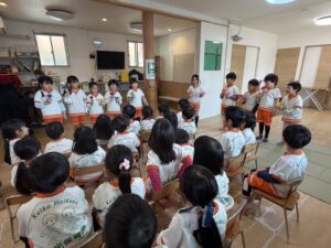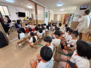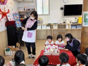 今月のお誕生日は、きりん組さん1名、うさぎ組さん1名、そしてM先生の3名です!みんなで大きなお誕生日ケーキを囲んで、元気いっぱいにお祝いしました。ライオン組さんからは、素敵なハンドベルの演奏のプレゼントがあり、綺麗な音色にみんなうっとり聴き入っていました。