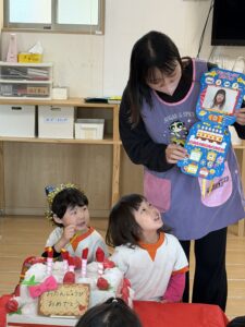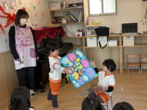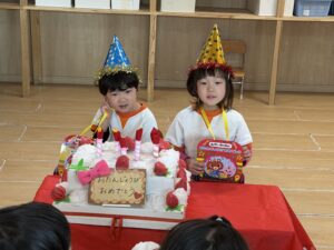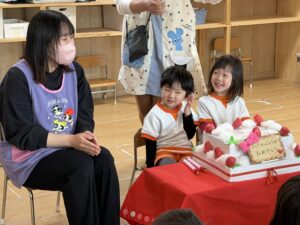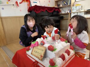 きりん組、うさぎ組、そしてライオン組(5歳児)さんも集まって、3月生まれのお友達のお誕生日会とお別れ会を行いました。