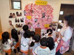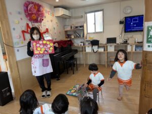また、4月から別の幼稚園へ転園することになったうさぎ組のお友達のお別れ会も行いました。先生やお友達からの心のこもった手作りのプレゼントカードを渡したり、テレビで「思い出アルバムのスライド」を観ながら「こんなこともあったね」と2年間一緒に過ごした日々を振り返りました。少し寂しいけれど、心温まる感動的な時間を過ごしました。「新しい幼稚園でも元気でね!」と、みんなでエールを送りましたよ!
