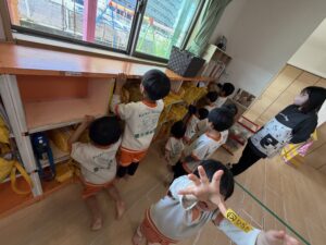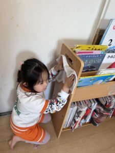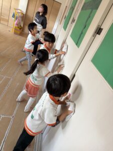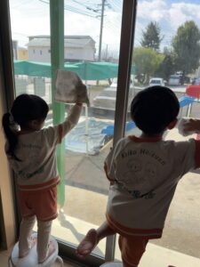 まずは自分のロッカーや靴箱の名前シールを丁寧に剥がし、雑巾を自分たちでギュッと絞って準備完了。窓やドアを背伸びしながら一生懸命拭いたり、みんなで横一列に並んで「よーい、ドン!」と床の雑巾がけを楽しんだりと、お部屋の隅々までピカピカに磨き上げてくれました。