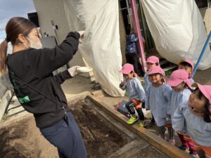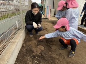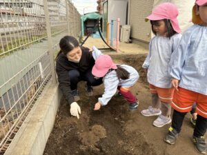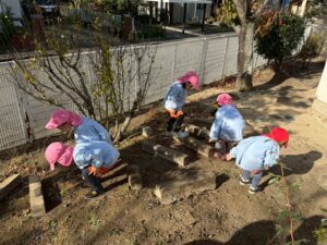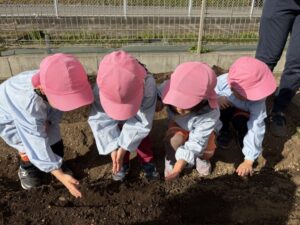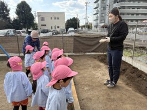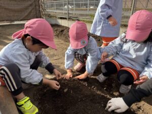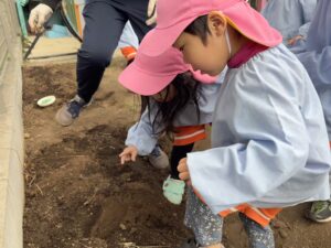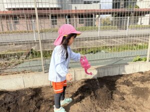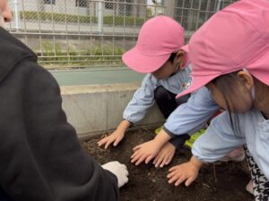 園庭の畑に、スナップえんどうとラディッシュの種を蒔きました。