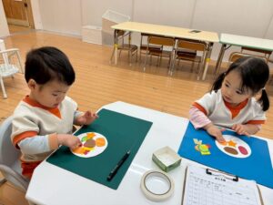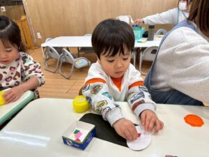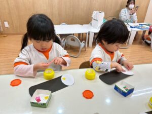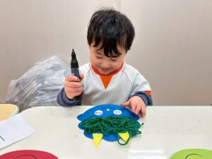 さあ、マジックで目を描いてみよう‼️手先がみんな、器用になって自分で出来ることがどんどん増えますね。