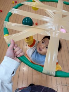 フープにガムテープを貼ってみました。ボールを下から投げるとペタンとくっつきます😊