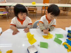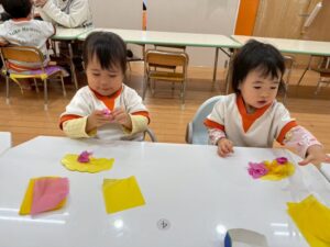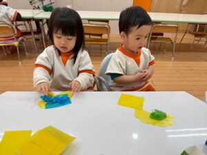 黄色と青色ペア、黄色と緑色ペア、黄色と桃色ペアで、好きな色の花紙を選びました。