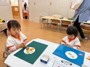 恵方巻きの具に見立てた、四角に切った色画用紙をのりで貼っていきます。すごく、真剣です😊
