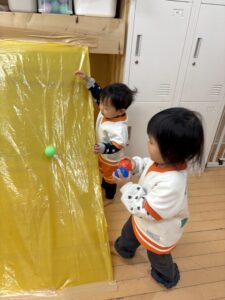 黄色のビニール袋を開いて壁と床に貼ってみました。おっ、上からボール転がすの?面白いね