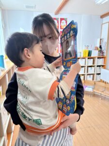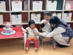 先生に一人ずつ、お誕生日を紹介してもらいます🥰マイクをむけると、うふふ🤭はずかしそうです😊