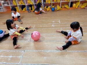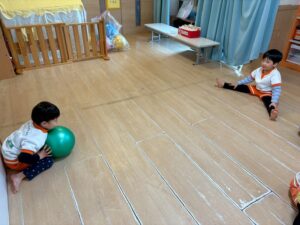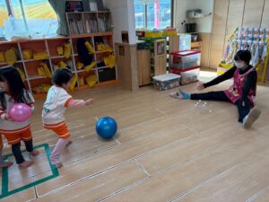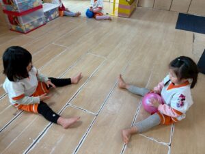 お友達とペアになってボールをまっすぐ転がします!違う方向にとんでいっては、笑顔がこぼれます😊