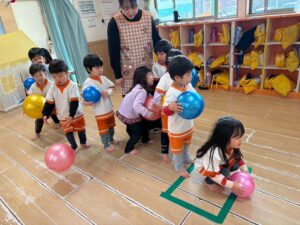 男の子VS女の子で、新聞紙にのせたボールを落とさないように運ぶゲームです!…のはずでしたが、皆、新聞でボールを包んで、抱っこしたまま走ってます😆!これはこれで盛り上がりました!