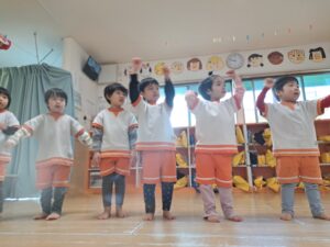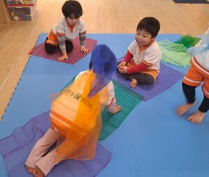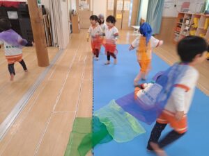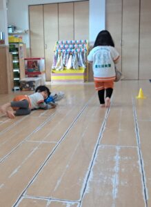 何人か足がでてしまったり、島に入れず、サメに食べられて、涙した子も、泣かないお約束を思い出し、ぐっと涙をこらえようとしていました。最後まで残った三人のお友だちの優勝です!!!