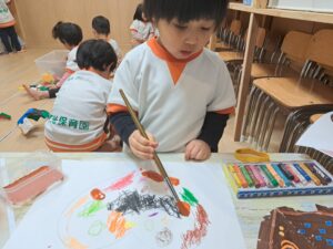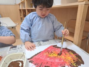 自分がクレヨンで描いた絵の上を、筆を走らせてもはじくので、ごしごしと塗り重ねようとしたり、「(絵が浮き)出てきた!」と、絵の具がクレヨンをはじくのを面白く感じたようです。