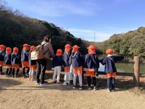 湖でかもや鯉を見ました。その後は広場に行き、遊具を楽しんだり、鬼ごっこや、草の上をころころ転がったり、虫を見つけたり好きな遊びを楽しみました。