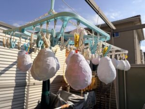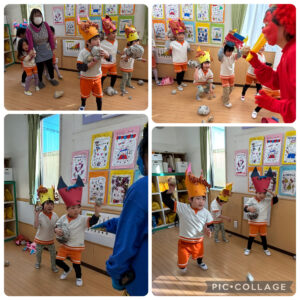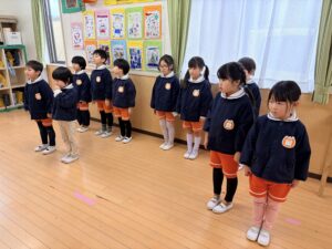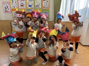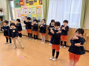 鬼が登場する前から女の子たちは怖い…!!と保育者の後ろに隠れていたのですが、それを見て男の子達が女の子達を守るように前に立ち、鬼が登場すると「おにはーそと!ふくはーうち!」と豆に見立てたボールを投げて鬼を退治していました。とてもたくましく頼もしい姿に感動しました。