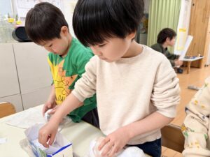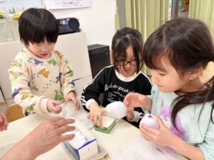 ひな祭りのお雛様とお内裏様を作り始めました。根気と集中力のいる製作ですが、みんな黙々と頑張って作っています。完成が楽しみです!