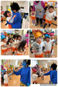 鬼を退治すると、福の神さんが登場です。幸せをもらおうね。と握手をしてもらい今年1年元気に過ごせるように願いました。