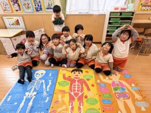 骨・内臓・筋肉のパズルをしました。3チームに分かれてみんなで力を合わせて完成させます。
