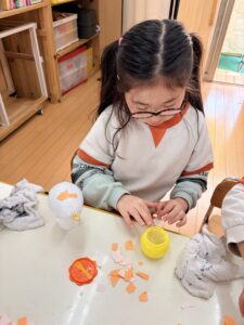 顔と頭を丁寧に丁寧に貼っていきます。強くにぎると土台がへこんだり、潰れてしまうのでとにかく丁寧に!がポイントになっています。集中・集中で進んでいきますが、男の子達は黙々と…女の子達は手元はかなり集中しながらもお喋りに花が咲いていました!