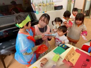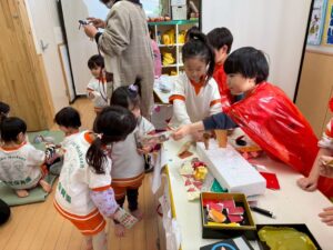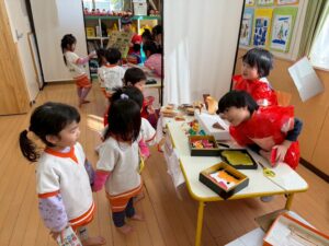 小さいお友だちの目線に合わせて優しく・分かりやすく話をしながら商品を売って、店員さんになりきっているらいおん組の子ども達。
