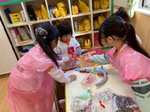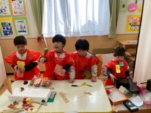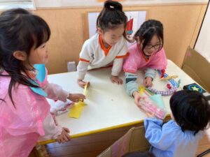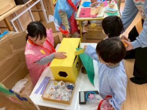 子ども達の遊びの中から1人2人とお店を作り始め自然と始まったお店屋さん作り。毎日こつこつ商品やお店、衣装などを作っていき、ついに開店しました!