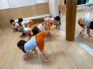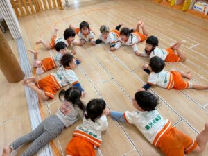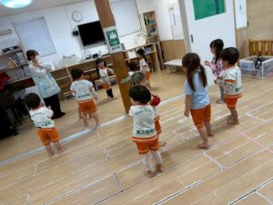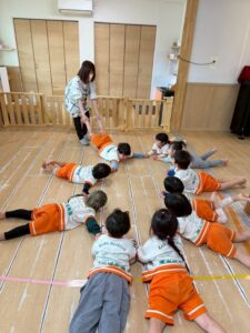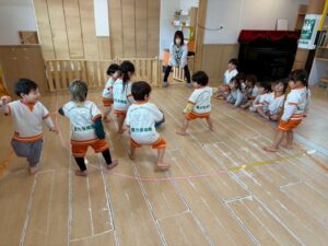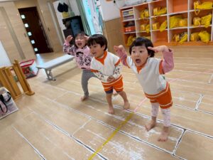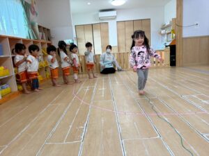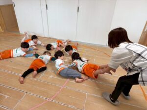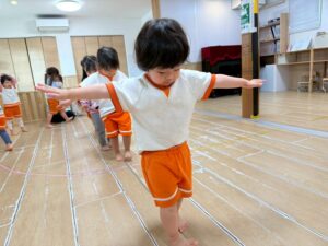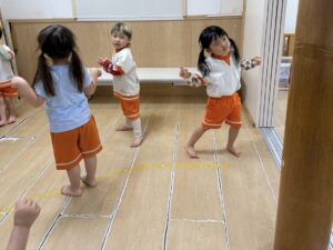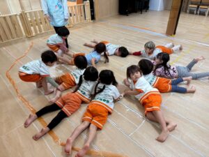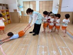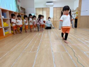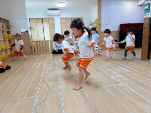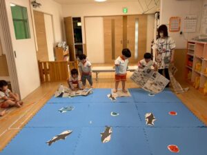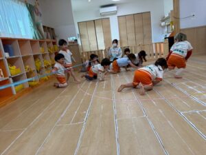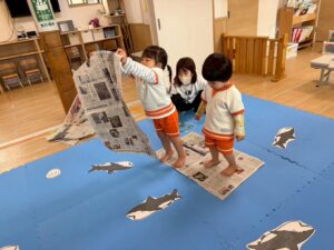 新聞紙を置いて行きながら海の上をどんどん渡って行きます。1人で頑張ったり、お友達と協力したりしながら取り組みました!