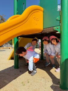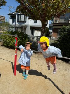 お兄ちゃんお姉ちゃんと手を繋いで楽しくお話ししながら歩き、はなまる公園まで行きました。