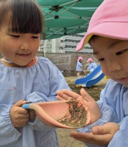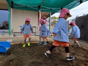 砂場が新しくなって足で踏んでみると気持ちよくて「ふかふか~」と言いながら歩いています☺️